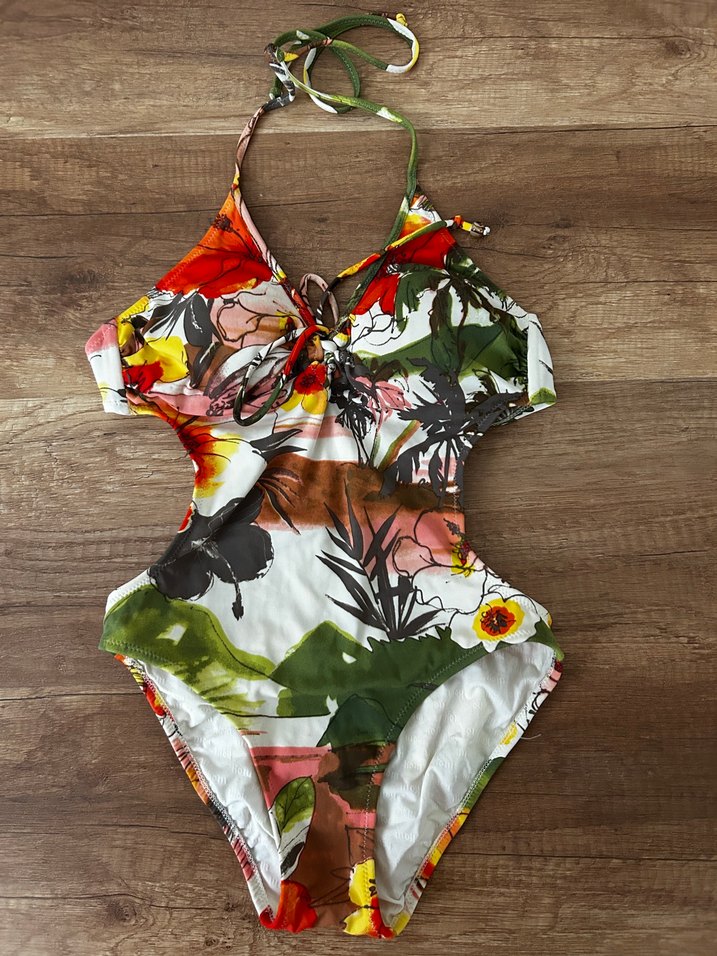 Farklı renklerde çiçek desenli, bohem tarzda, askılı mayokini. Kullanıldı ama renk solması vs hiçbir sorunu yok temiz mayokini