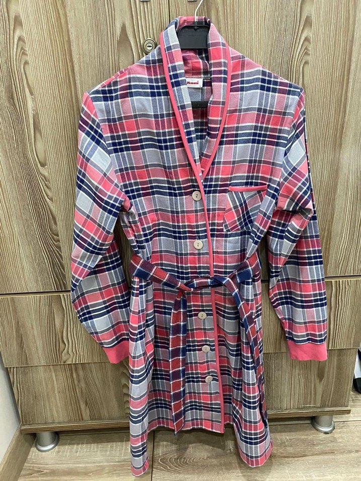 Uzun kollu, uzun boy renkli ekose desenli kadın sabahlığı. Düğmeli ve belden bağlamalı, rahat kesim ve konforlu dokuda.Boy 87, iki kol arası genişlik 48 cm, pamuklu kumaştır