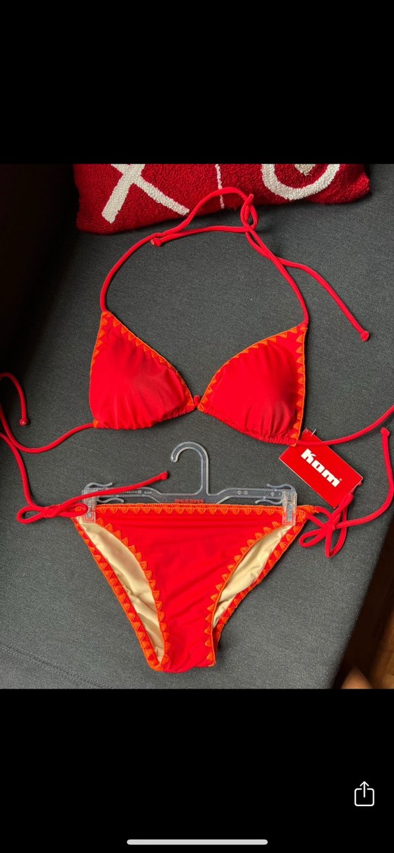 Kırmızı ipli, kısa kesim, vücuda oturan bikini takımı. Canlı ve desen içermeyen bohem tarzıyla plajda dikkat çekici ve rahat bir şıklık sunar. ️