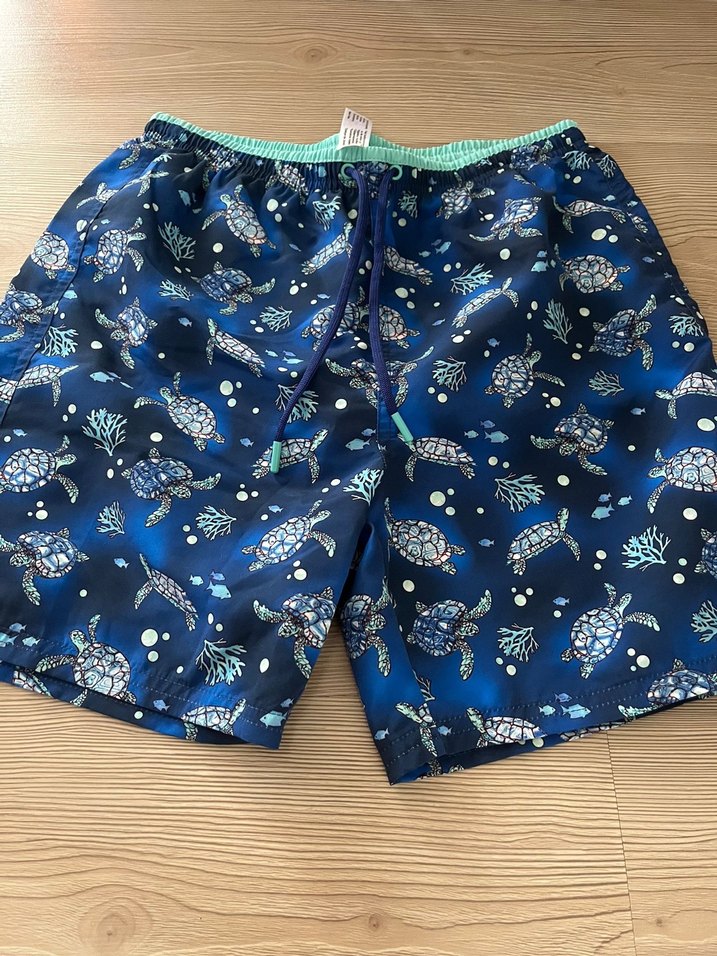 Renkli deniz kaplumbağası desenli, ayarlanabilir bel bantlı mavi erkek çocuk yüzme şortu. Çok az kullanımmış 11 12 yaş aralığıdır kategoride bulamadım