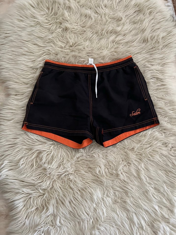 Sokak stiliyle tasarlanmış, mini boy, siyah erkek deniz şortu. Sentetik kumaştan, turuncu detaylarla cesur ve şık bir görünüm sunar.