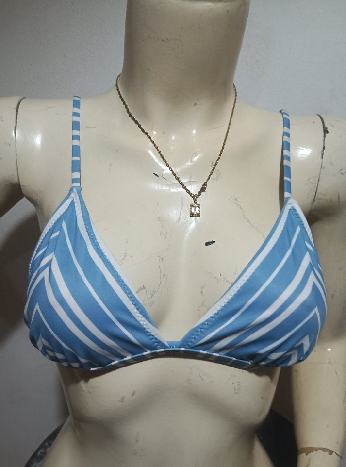 Mavi, ince askılı, hafif batik desenli ve zincir detaylı, kısa kesim bohem tarzı bikini üstü. S/M