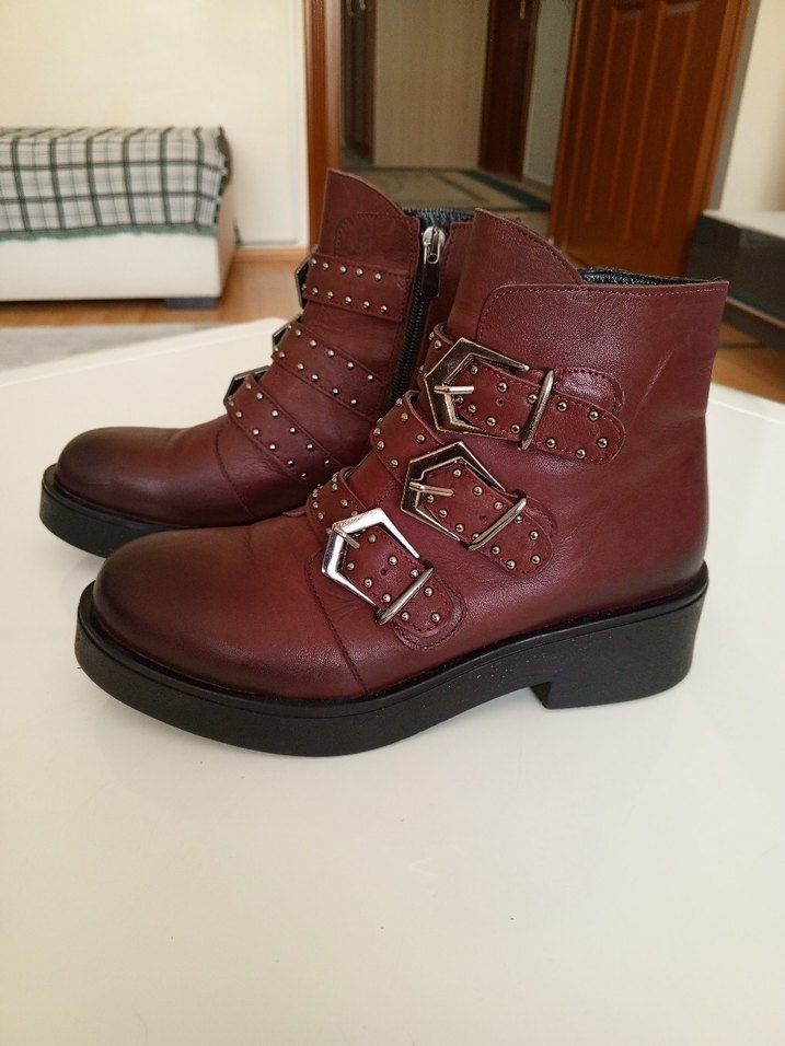 Bordo deri biker botlar, blok topuklu ve üç tokalı kayışlı, parlak yüzeye sahip, günlük sokak stili için uygun.