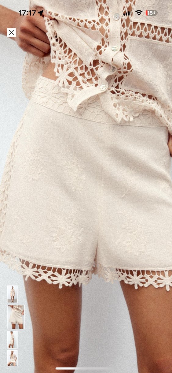 Bej renkte, nakışlı ve dantelli detaylara sahip pamuklu mini şort. Bol kesimi ve bohem Paris tarzını yansıtır. Düğünler için uygun.