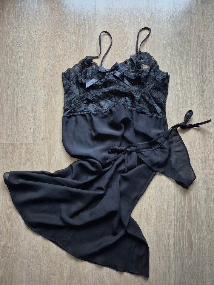 Siyah, dantel detaylı, askılı, mini uzunlukta, bol kesim gotik tarzda gecelik. Kombinezon Siyah Tül Gecelik Kısa L-XL beden Sistina Marka