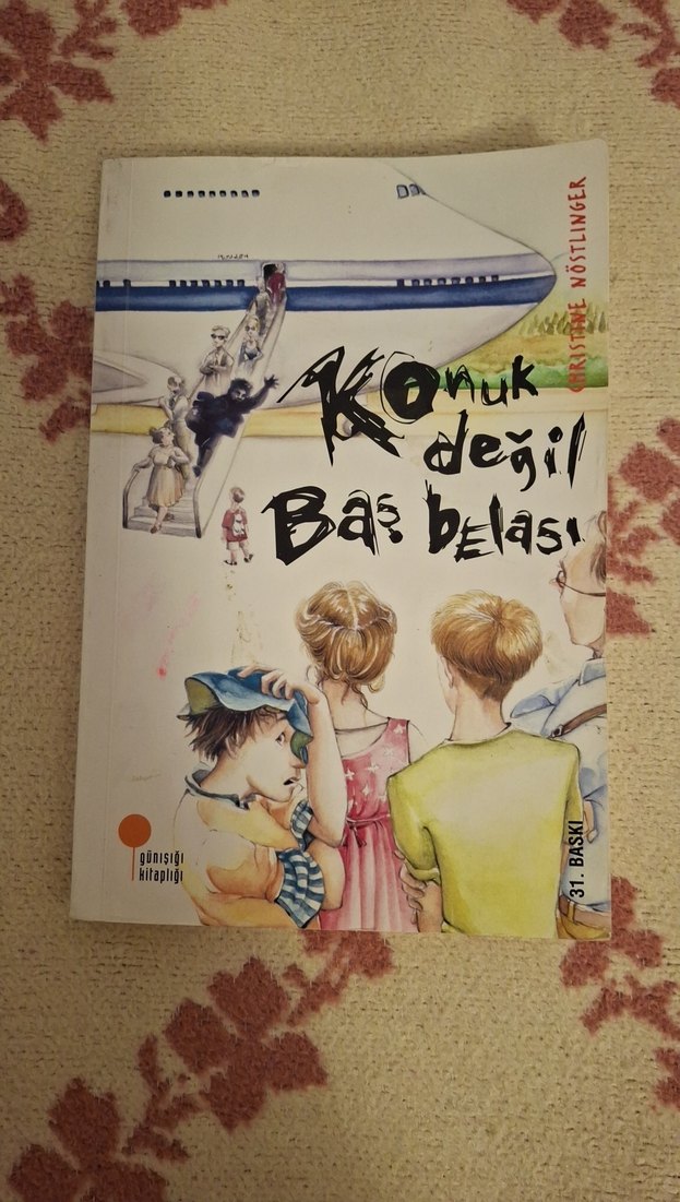 Kristiane Nöstlinger'in 'Komik Değil Baş Belası' adlı sanat kitabı, çocuklar ve uçak temalı çizimli kapağıyla görsel bir anlatım sunar. kapağında ufak çizikler var
