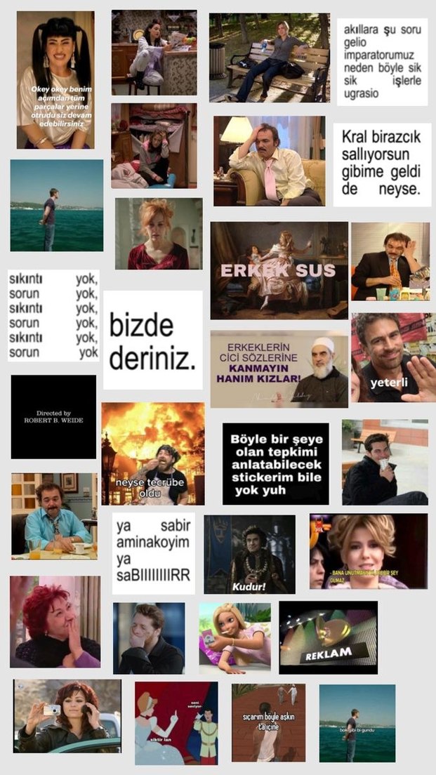 Türkçe komik dizi sözleri ve tepkiler içeren çeşitli ifadelerden oluşan sticker seti.