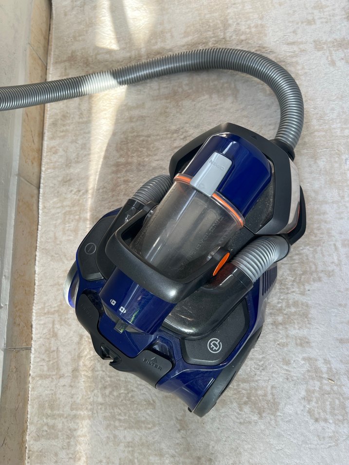 Çıkarılabilir toz haznesi ve esnek hortumu olan kompakt koyu mavi elektrikli süpürge.