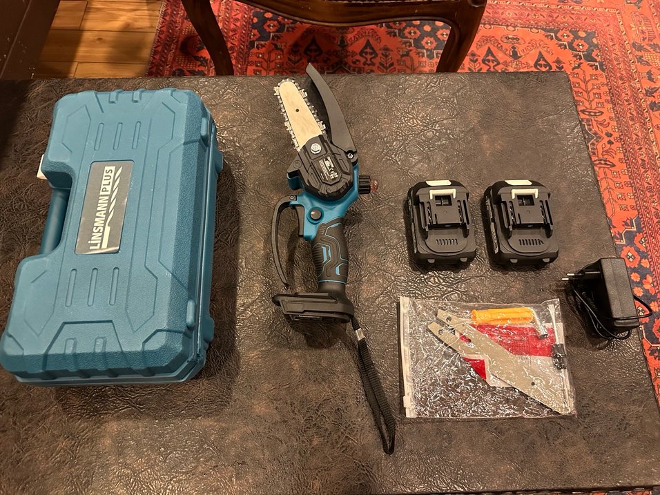 Ergonomik saplı kompakt mavi mini zincirli testere, taşıma kutusu ve iki pil ile birlikte. Kolay kullanım ve taşınabilirlik sağlar.