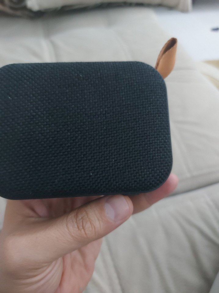 Kompakt siyah kumaş kaplı Bluetooth hoparlör, taşınabilirlik için küçük deri askıya sahip. Kablosuz ses sunar.