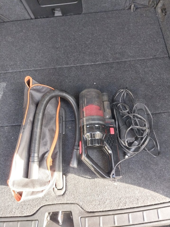 Kompakt siyah elektrikli süpürge, çıkarılabilir hortum ve kablo ile kolay temizlik sağlar. Aksesuarlar için saklama çantası dahildir.