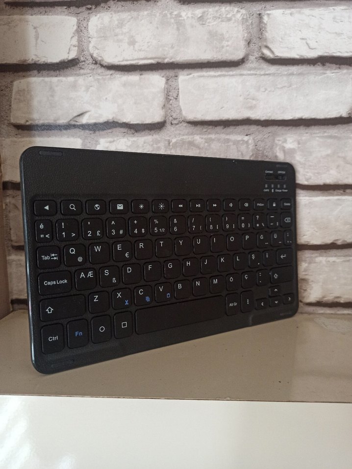 Kompakt siyah kablosuz klavye, ince yapısı ve koyu tuşlarıyla rahat yazma ve taşınabilirlik sağlar. ⌨️ Bluetooth klavye ince tasarım
