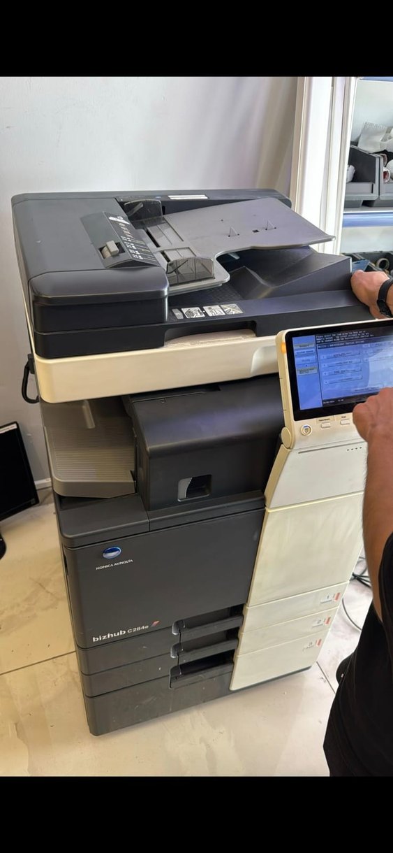Konica Minolta Bizhub C224e, dokunmatik ekran ve çoklu kağıt tepsileriyle gri çok işlevli yazıcıdır. ️