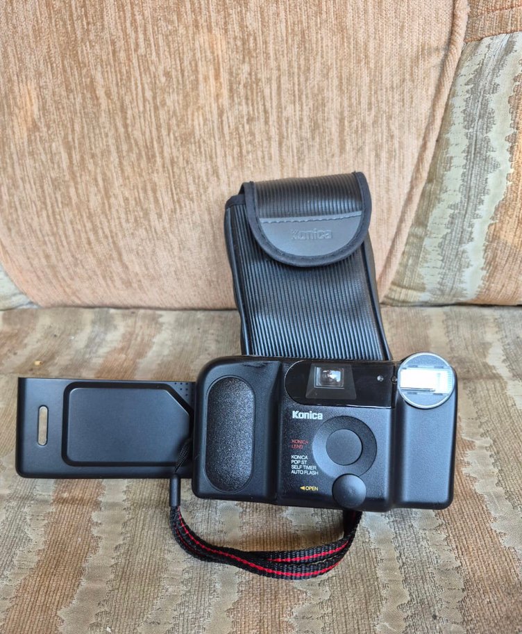 Siyah Konica filmli kamera, dokulu tutma yeri ve taşıma kolaylığı için bileklik kayışı içerir. Dahili flaş ve koruyucu kılıf mevcuttur.
