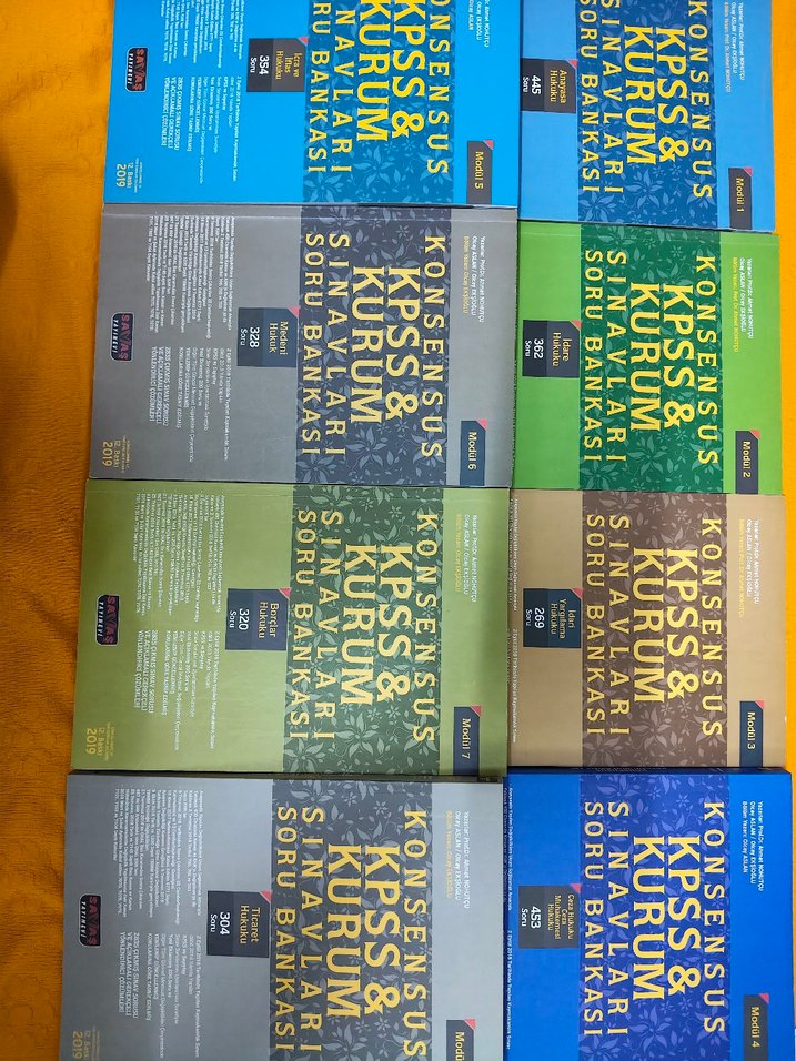 Konsensus KPSS kurs ve soru bankası kitaplarından oluşan çeşitli ciltler. Sınav hazırlığı için çoklu konuları kapsar.