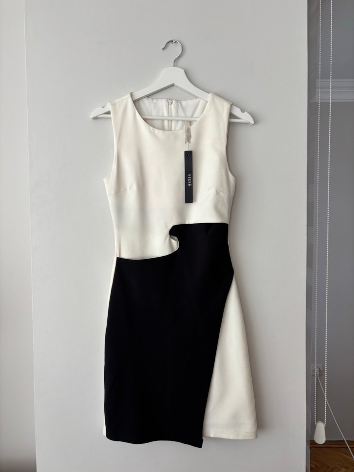 Kontrast detaylı, kolsuz midi elbise. Beyaz ve siyah renklerin modern uyumu, şık tasarım.