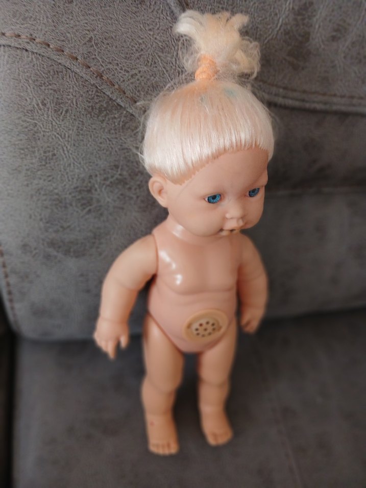 Sarı saçlı, mavi gözlü bej tenli pastel bebek. Göbek deliği detaylı, koleksiyon veya oyun için uygun. konuşan acıktım,otun oynayalım I gibi birçok şey konuşuyor