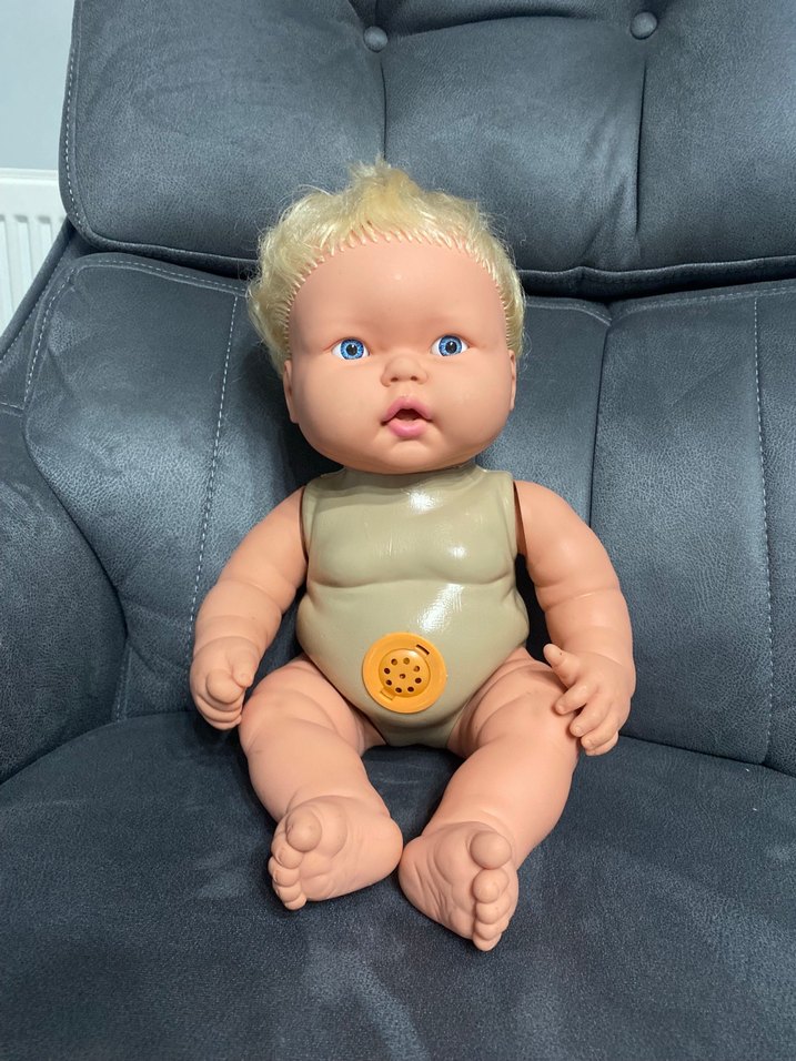 Sarı saçlı, mavi gözlü bebek oyuncağın gövdesi gri renkte ve turuncu düğmeli.temiz ve sorunsuzdur konuşuyor yaklaşık 45 cm dir