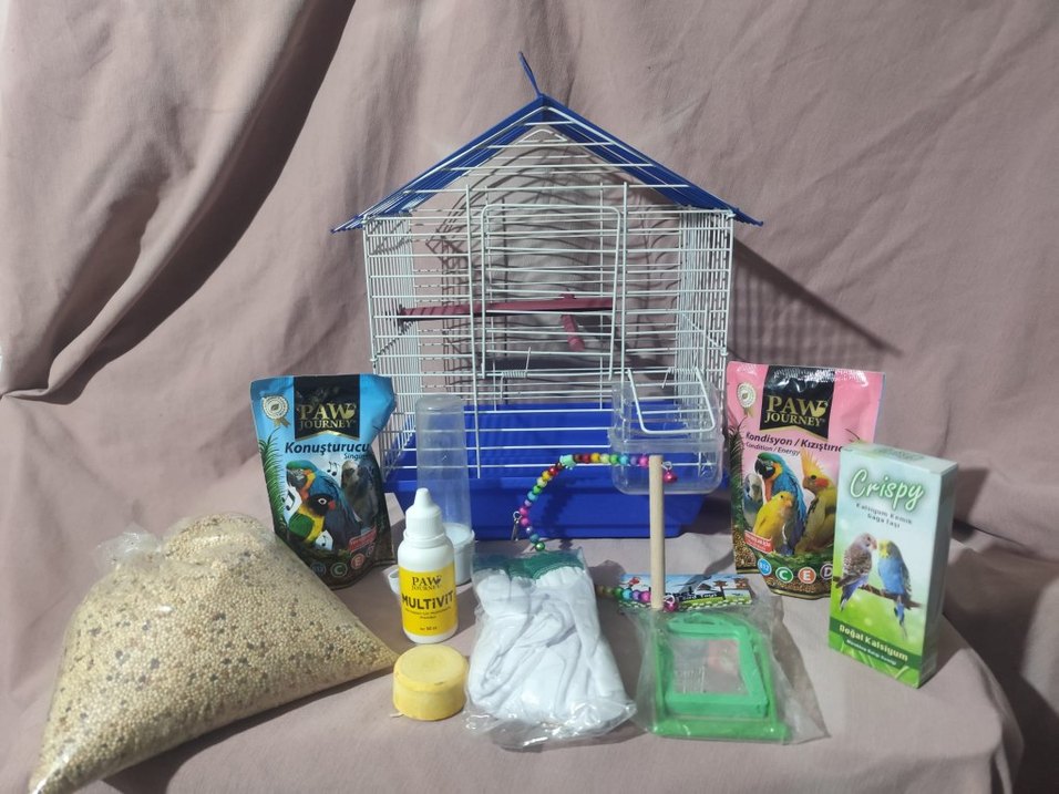 Renkli papağan kafesi seti, yem, multivitamin damlası, oyuncaklar ve aksesuarlarla birlikte. Mavi kafes ve çeşitli pet bakım ürünleri içerir. ürünler sıfırdir