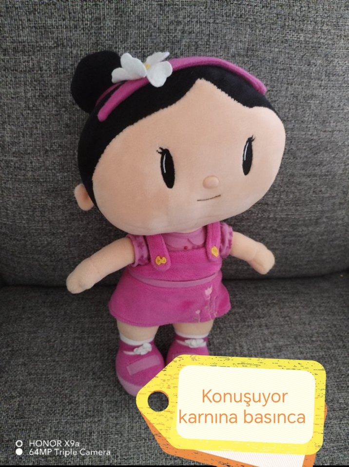 Yumuşak pastel pembe renkli, siyah saçlı ve çiçekli taçlı peluş kız bebek. Elbise ve uyumlu ayakkabılar içerir. Konuşuyor çalışıyor