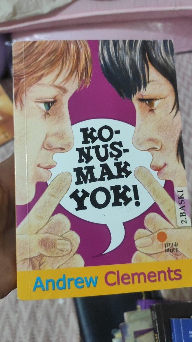 Andrew Clements'in "Konuşmak Yok!" adlı kitabı, iletişim zorlukları üzerine mizahi bir hikaye sunuyor. İki karakterin yüz yüze karşılaşması resmediliyor.