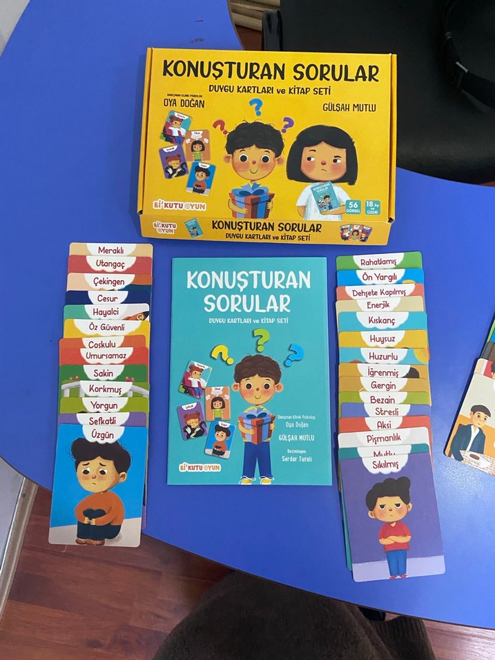 "KonuşTuran Sorular" seti, çocukların duygularını tanıması ve ifade etmesine yardımcı olan duygu kartları ve kitap içerir. Renkli kartlar ve rehber kitap bulunur.