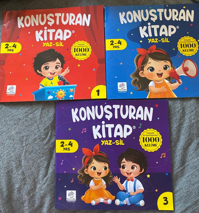 2-4 yaş çocuklar için 3 adet Konuşturan Yaz-Sil kitap seti. Her kitap 1000'den fazla Türkçe kelime içerir ve yazılıp silinerek interaktif öğrenim sağlar.