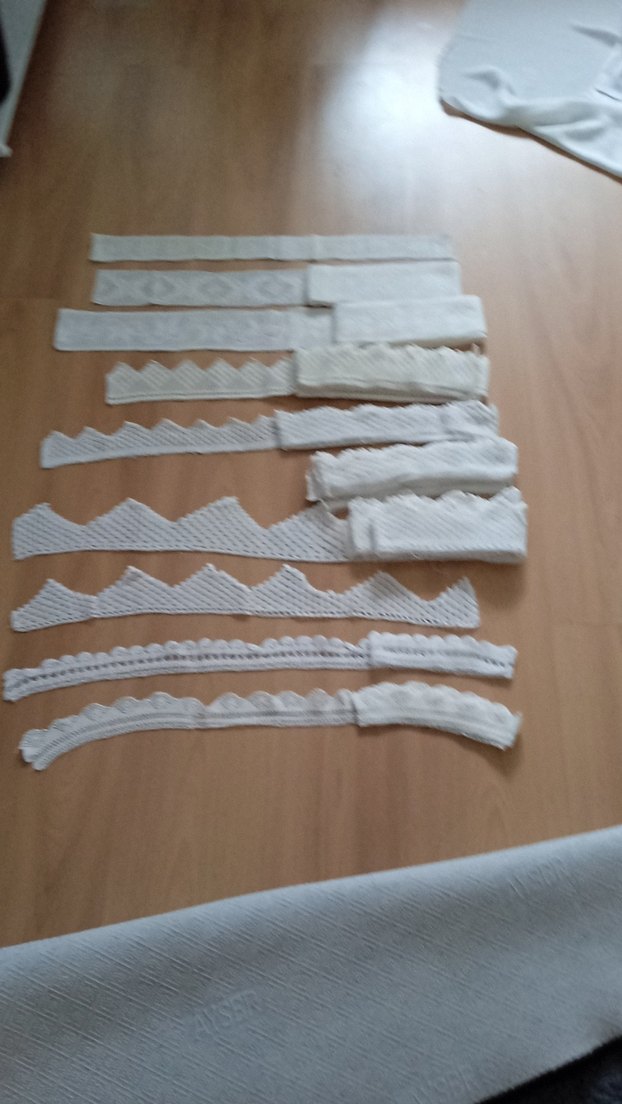 Farklı geleneksel desenlerde ve genişliklerde çeşitli el yapımı dantel şeritler. Dekoratif kullanım için uygundur.