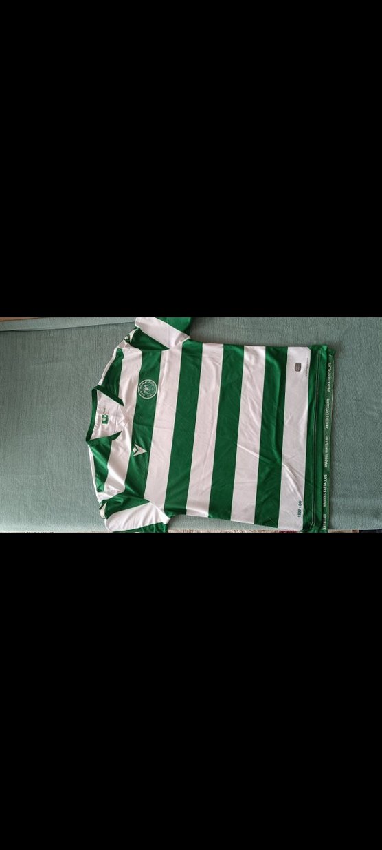 Yeşil ve beyaz yatay çizgili, kısa kollu ve bisiklet yaka erkek forması. Sentetik kumaştan, fitted kesim ve cırt cırt detaylıdır. Günlük rahat stil için uygundur.