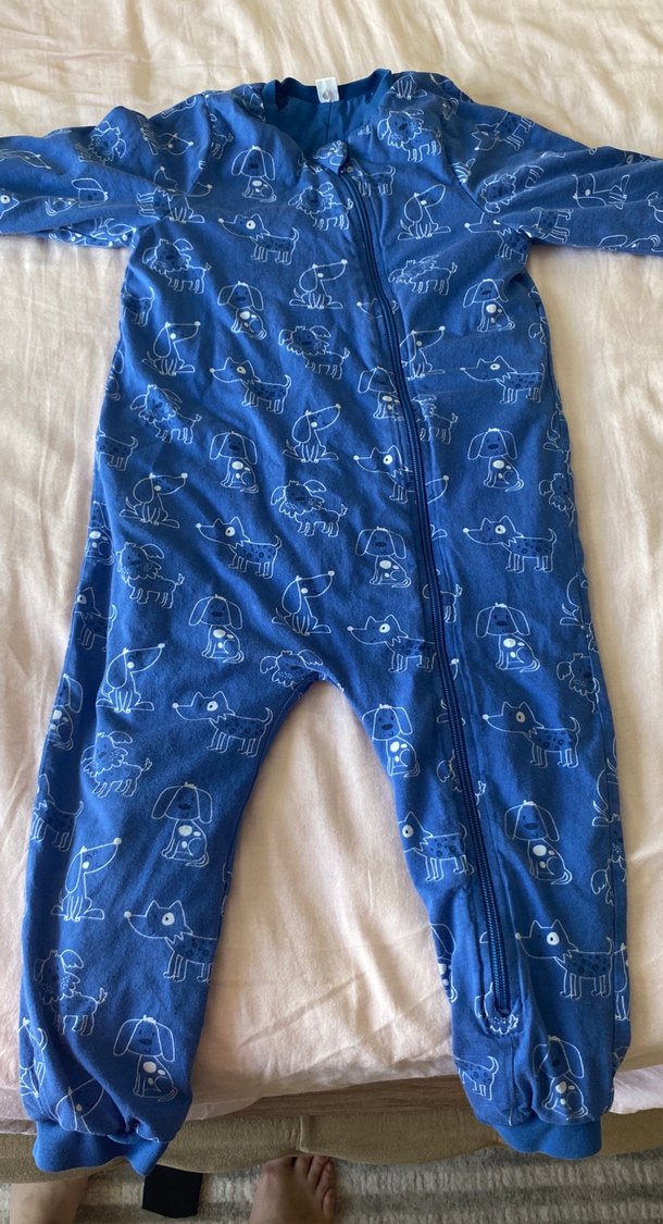 Koyu mavi renkli, fermuarlı, uzun kollu ve yakalı bebek tulumu. Yumuşak ve sıcak kumaştan, köpek desenlidir. 1.6 tog kalınlığında .4-5 yaş diyor ama o kadar büyük değil bence. Alalı 1 ay bile olmadı .2 yaşındaki oğlum giymeyi sevmediği için yarı fiyatına satıyorum .