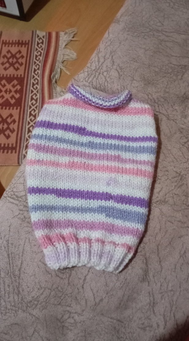 Küçük cins kedi, köpek için ,çok renkli pastel tonlarda çizgili, örgü dokulu ve dar kesim triko kazak. Desensiz, karşı kültür tarzında.