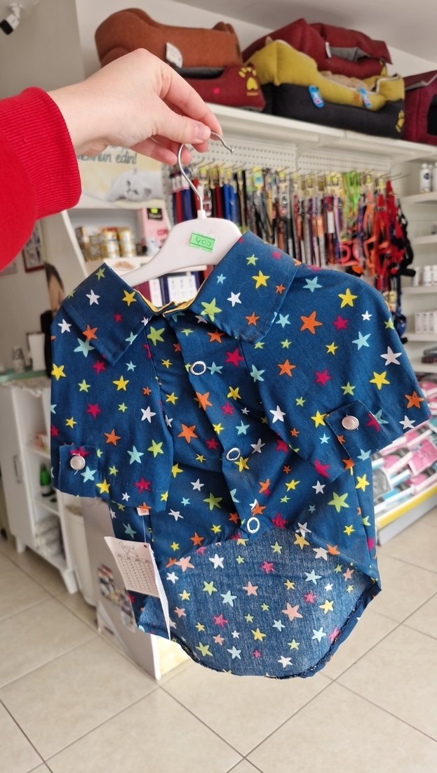 XL beden mevcuttur. 15 kg'a kadar uygun. Renkli yıldız desenleriyle süslenmiş, pop kültür tarzında köpek kıyafeti. "PAWSTAR" etiketi bulunur.