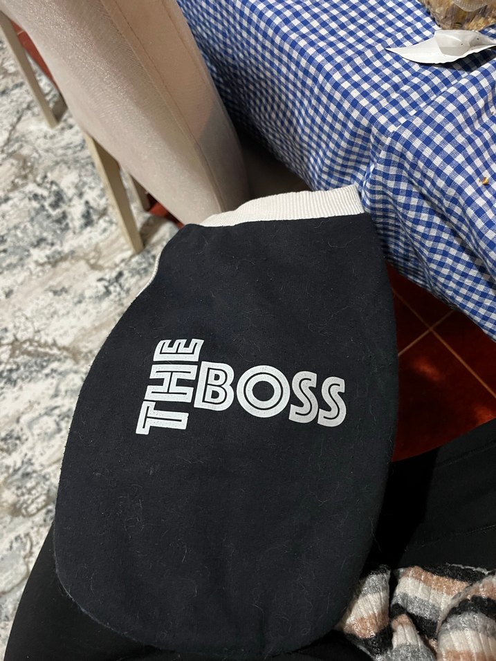 Siyah renkte, "THE BOSS" baskılı ve kolay giydirme için cırt cırtlı köpek kıyafeti. Rahat ve şık tasarım.