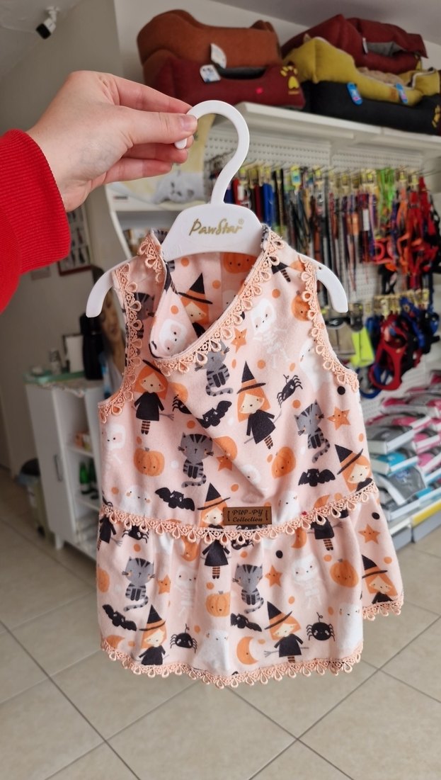 S/M/L/XL bedenleri mevcuttur. Kolsuz, bol kesim köpek elbisesi, yakalı ve fırfır detaylıdır. Pastel pembe renkte, baskılı bohem desene sahiptir