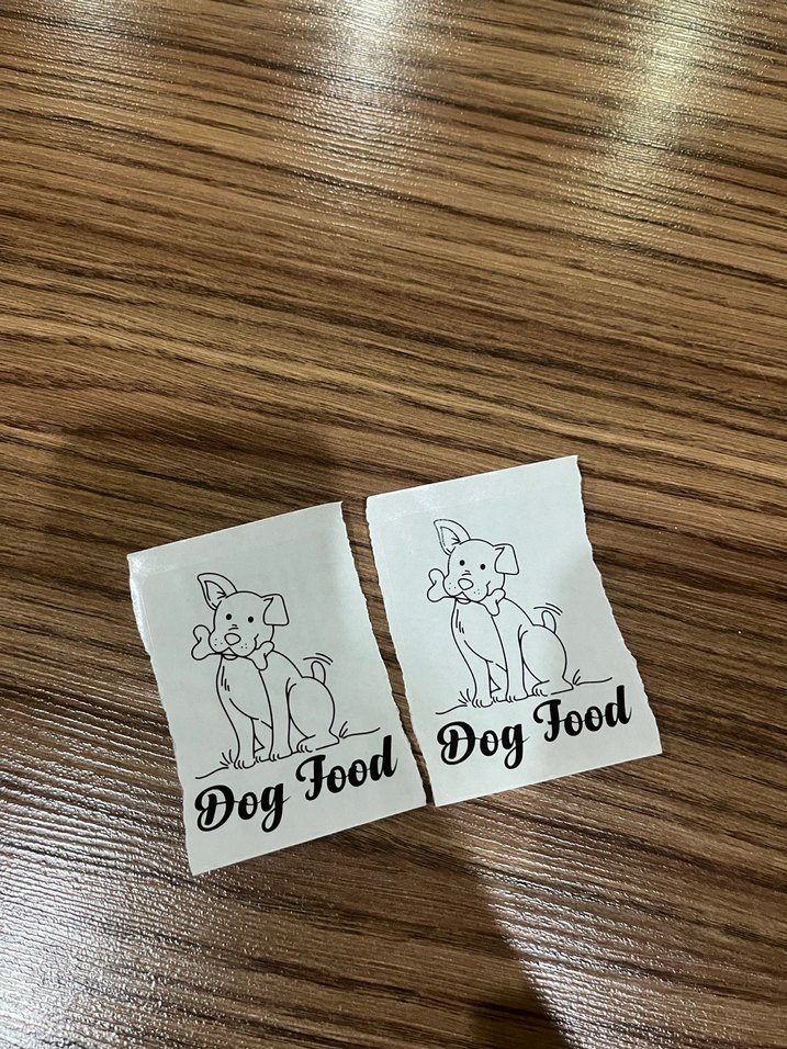 Üzerinde köpek resmi ve 'Dog Food' yazısı bulunan küçük köpek maması paketleri.