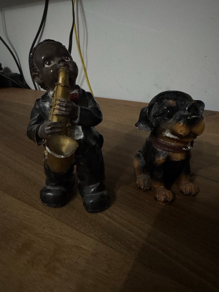 Detaylı özelliklere sahip koyu köpek ve müzisyen figürü, gerçekçi bir pozda oturuyor. Biblo