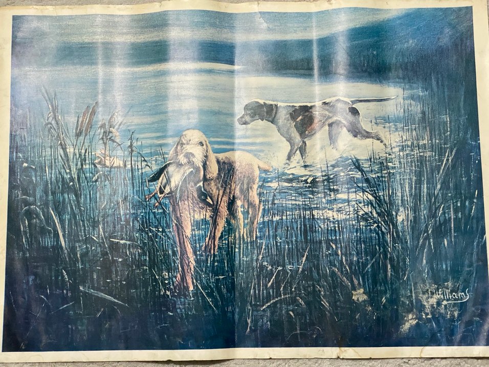 Gri ve camel tonlarında iki köpeğin doğal ortamda yer aldığı detaylı bir yağlı boya tablosu . Köpeklerin hareketi ve çevresi yansıtılmıştır.