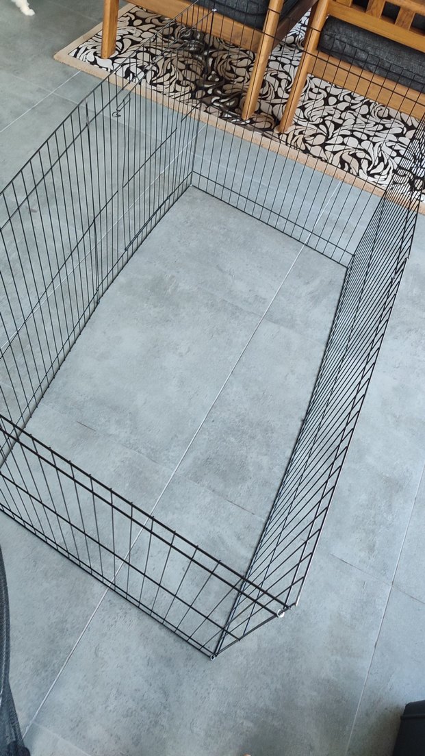 Gri metal çerçeveli oyun alanı çiti, çocuklar veya evcil hayvanlar için güvenli bir alan sağlar. Dayanıklı ve şeffaf yapıya sahiptir.