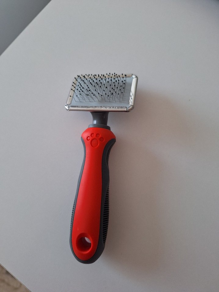 Kırmızı saplı, metal kıllı tüy ve saç temizleme fırçası. kedi köpek