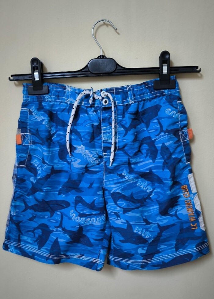 7-8 yaş erkek çocuk için mavi renkli köpekbalığı desenli deniz ve havuz şortu. Küçük geldiği için satıyorum. Temiz ve sağlam.