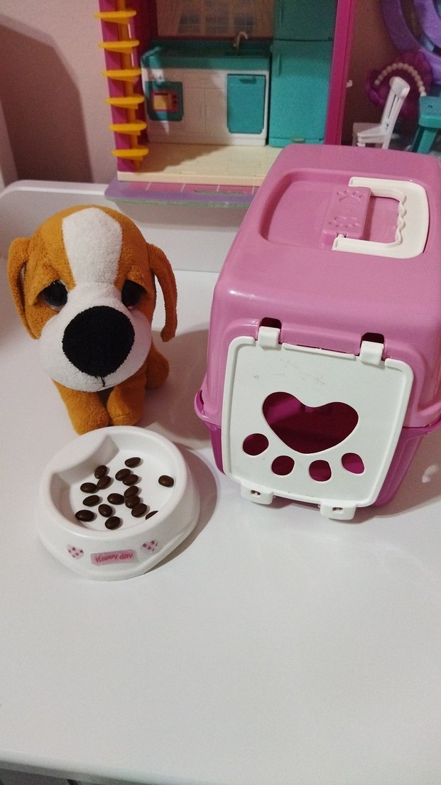 Pastel pembe evcil hayvan taşıyıcı, kalp şeklinde camlı kapak ve beyaz tutma sapına sahiptir. Paw desenli beyaz mama kabı ve küçük peluş köpek oyuncak ile birlikte.
