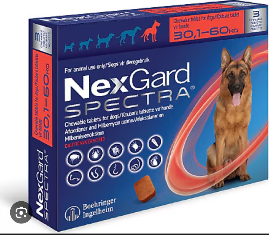 NexGard Spectra, 30,1-6 kg köpekler için çiğneme tableti. Pire, kene ve çeşitli parazitlere karşı koruma sağlar. Boehringer Ingelheim üretimi.