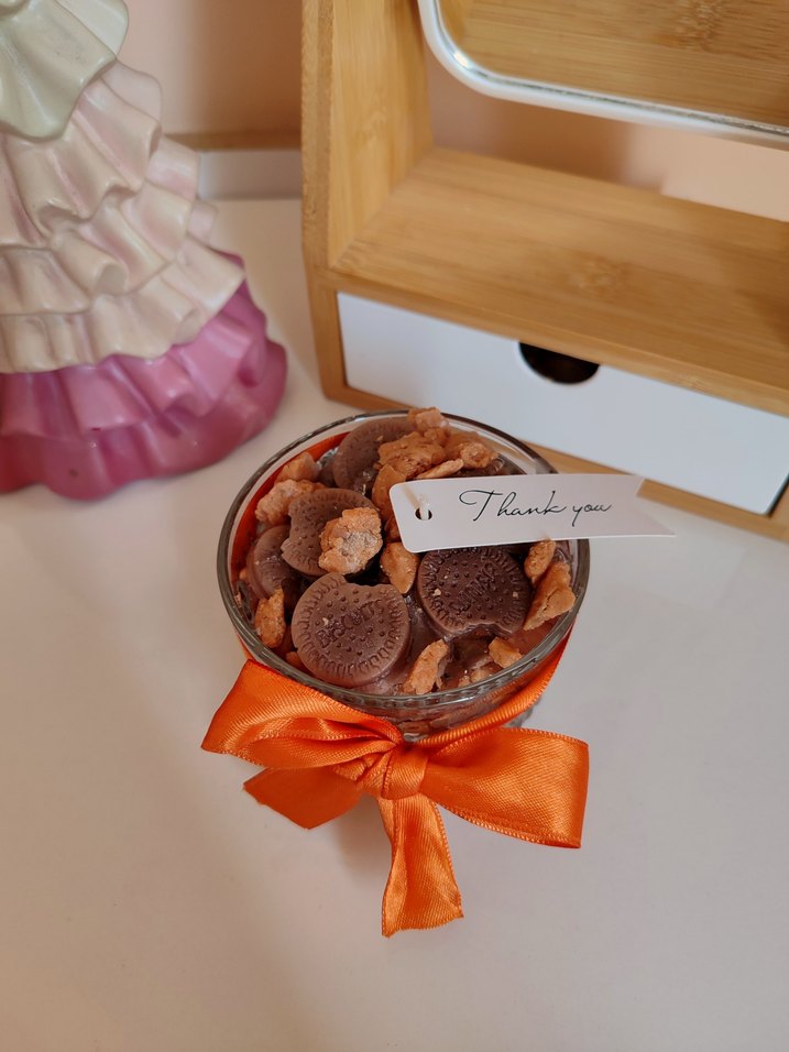 Köpekler için karışık kıtır ve yumuşak atıştırmalıklar, turuncu kurdele ve teşekkür notu ile süslenmiş bir kase