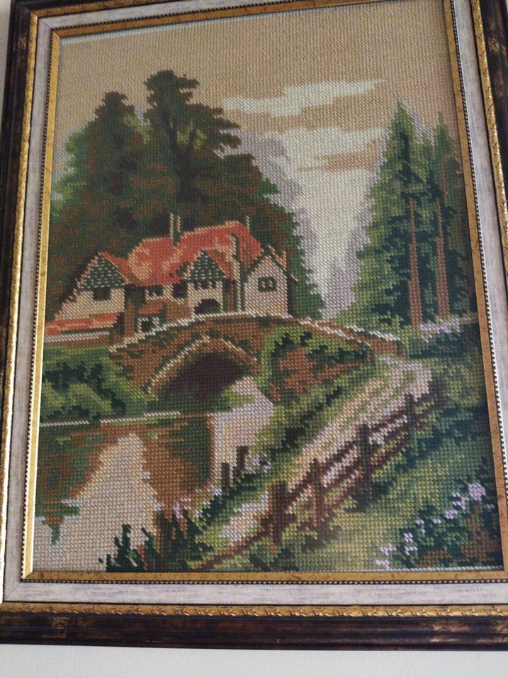 Çerçeveli Goblen tablo, nehir üzerindeki taş köprü ve ev ile çevresinde ağaçlar ve yeşillikler gösterir. Koyu kahverengi ve yeşil tonlar kullanılmıştır. ️El işlemelidir.47,5cm-38cm ölçüsündedir.