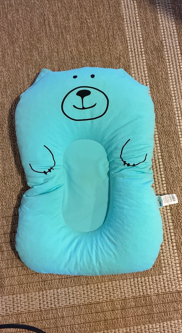 Yumuşak kumaştan yapılmış, ayıcık yüzü desenli turkuaz çocuk banyo yatağı