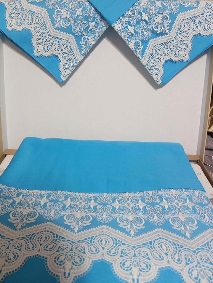 Açık mavi nevresim takımı kenarlarında ince beyaz köpür detaylarıyla klasik bir görünüm sunar. 2 adet yastık kılıfı 1 adet çarşaf 1 adet nevresim
