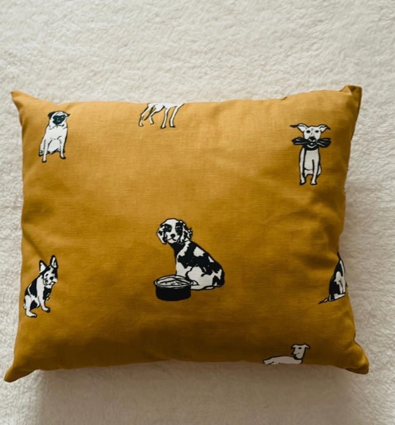 Hardal sarısı yastık, üzerinde çeşitli köpek desenleri bulunan yumuşak kumaştan yapılmıştır ve modern bir dokunuş katar.