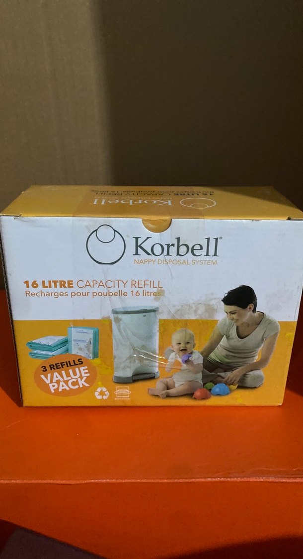 Korbell bebek bezi atık sistemi için 16 litre kapasiteli, 3 adet doldurulabilir torba paketi. Açık kamel renk kutu.