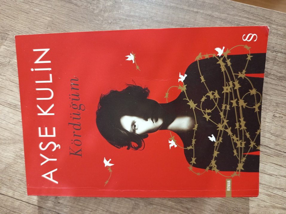 "Kördüğüm" adlı roman, kırmızı zemin üzerinde dikenli sarmaşıklar ve beyaz kuşlarla çevrili bir kadının siluetini içeren dikkat çekici kapağa sahiptir.
