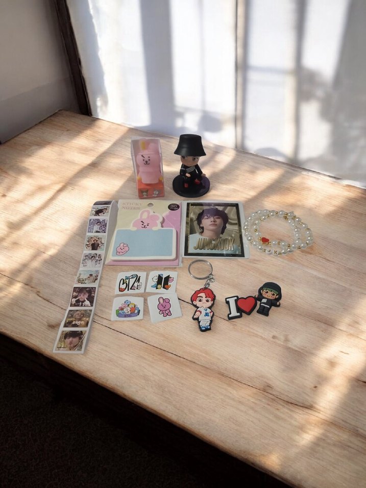 1 adet jungkook idol figür 1 adet kalemtras 1 adet yapışkanlı notluk 1 adet jungkook anahtarlık 2 adet crocs terlik süsü 1 adet BTS sticker seti 2 adet bileklik 1 adet hologramli pvc kart